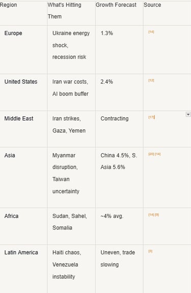 Open a news app/website on any given day in 2026 and you'll find the same thing: another conflict, another airstrike, another city under siege. The world is fighting on more fronts simultaneously than it has in decades — and the global economy is paying the price. This isn't just about human suffering, as enormous as that is. Wars destroy crops, block shipping lanes, spike oil prices, and send millions of people fleeing across borders. When that happens in enough places at once, the entire world feels it — at the gas pump, the grocery store, and in sluggish economic growth. Here's a plain-language breakdown of what's happening, where, and why it matters to your wallet.