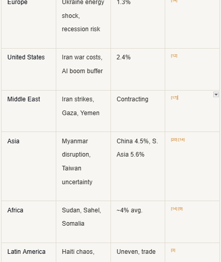 In early 2026, the US and Israel launched strikes on Iran's nuclear sites — with reports that Supreme Leader Khamenei was killed. Oil prices risk surpassing $130 a barrel. This war alone could add 2.5 percentage points to global inflation. The Middle East is heading toward outright economic contraction.